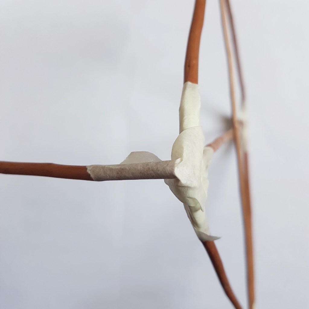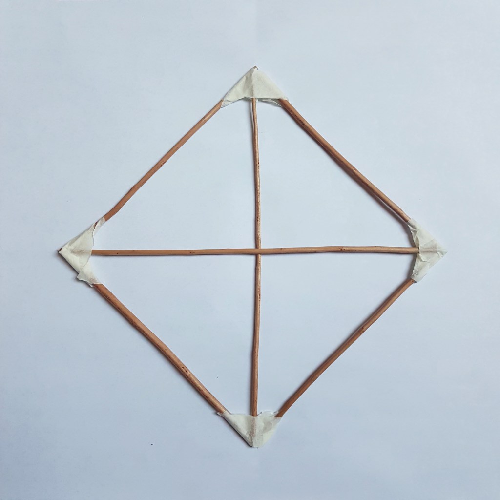 Next place the medium sized sticks in the diagonal of the square and again secure with masking tape onto your square frame.
