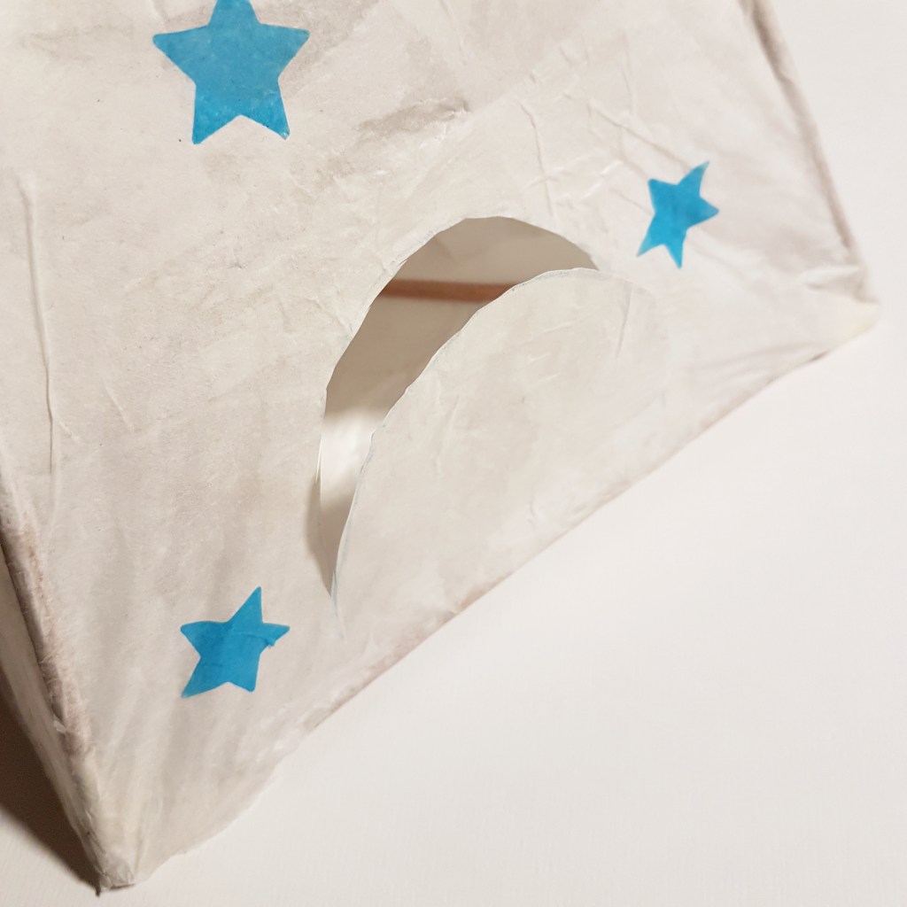 I used a star punch to decorate my lantern with blue stars, but if you don’t have one just draw a star template onto stiff card and cut it out. Fold several pieces of tissue paper together and then cut through the tissue paper to get lots of stars.
